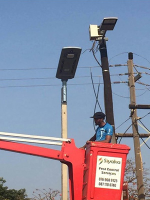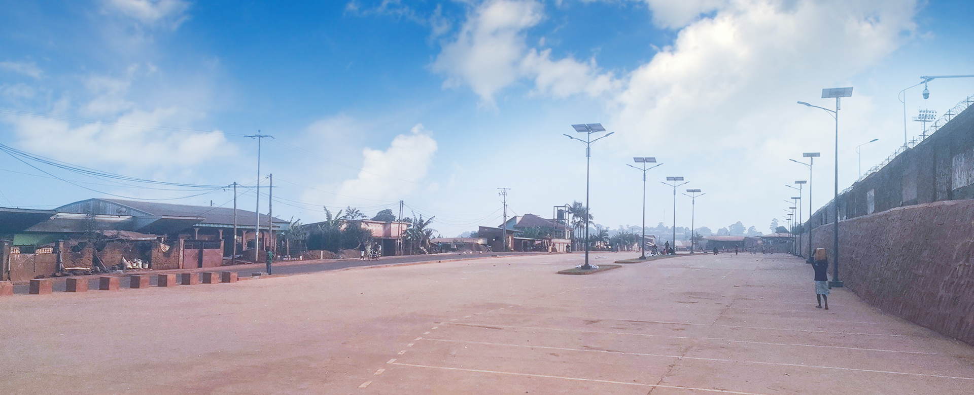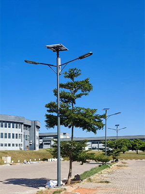 贊比亞的這組案例最大的不同在于采用中間布燈。中間布燈可以提供均勻照明、減少眩光、創(chuàng)造更開闊感的空間。人字臂和分體式太陽能路燈星辰的結合讓整組案例的性價比達到了最高。